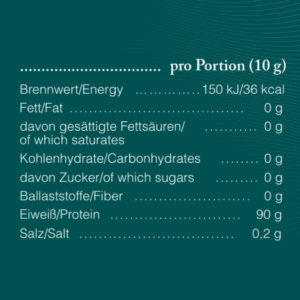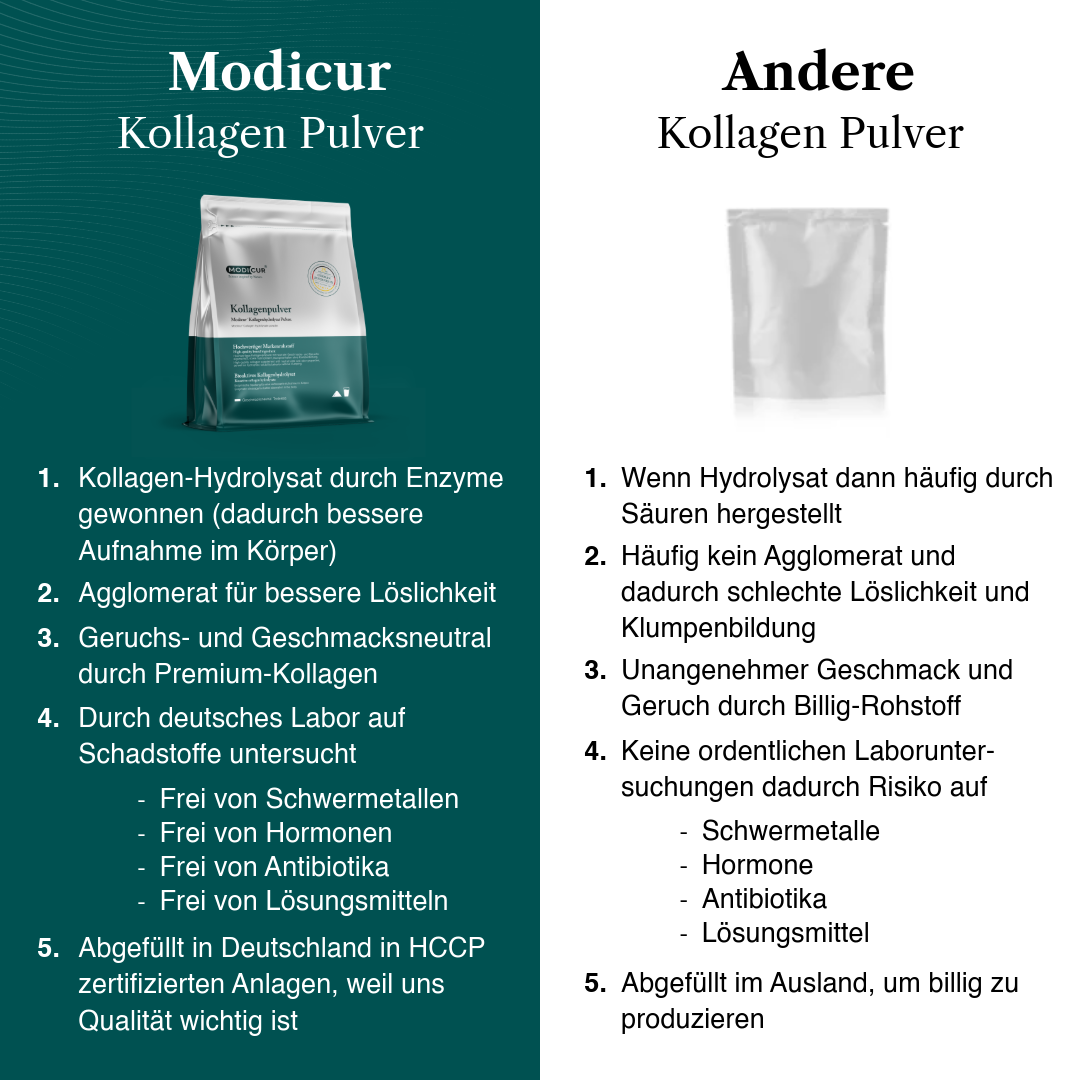 Das Kollagenpulver besteht aus 100% Kollagen-Hydrolysat und wir in Deutschland in HCCP-zertifizierten Anlagen abgefüllt.