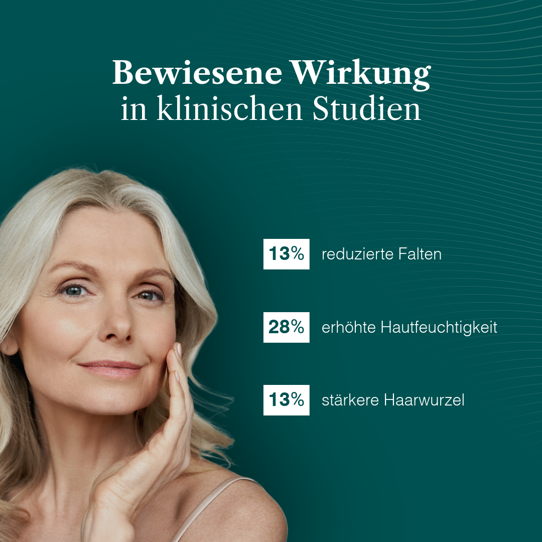 Straffere und leuchtendere Haut, volleren und glänzendere Haare und stabilere und glattere Nägel.