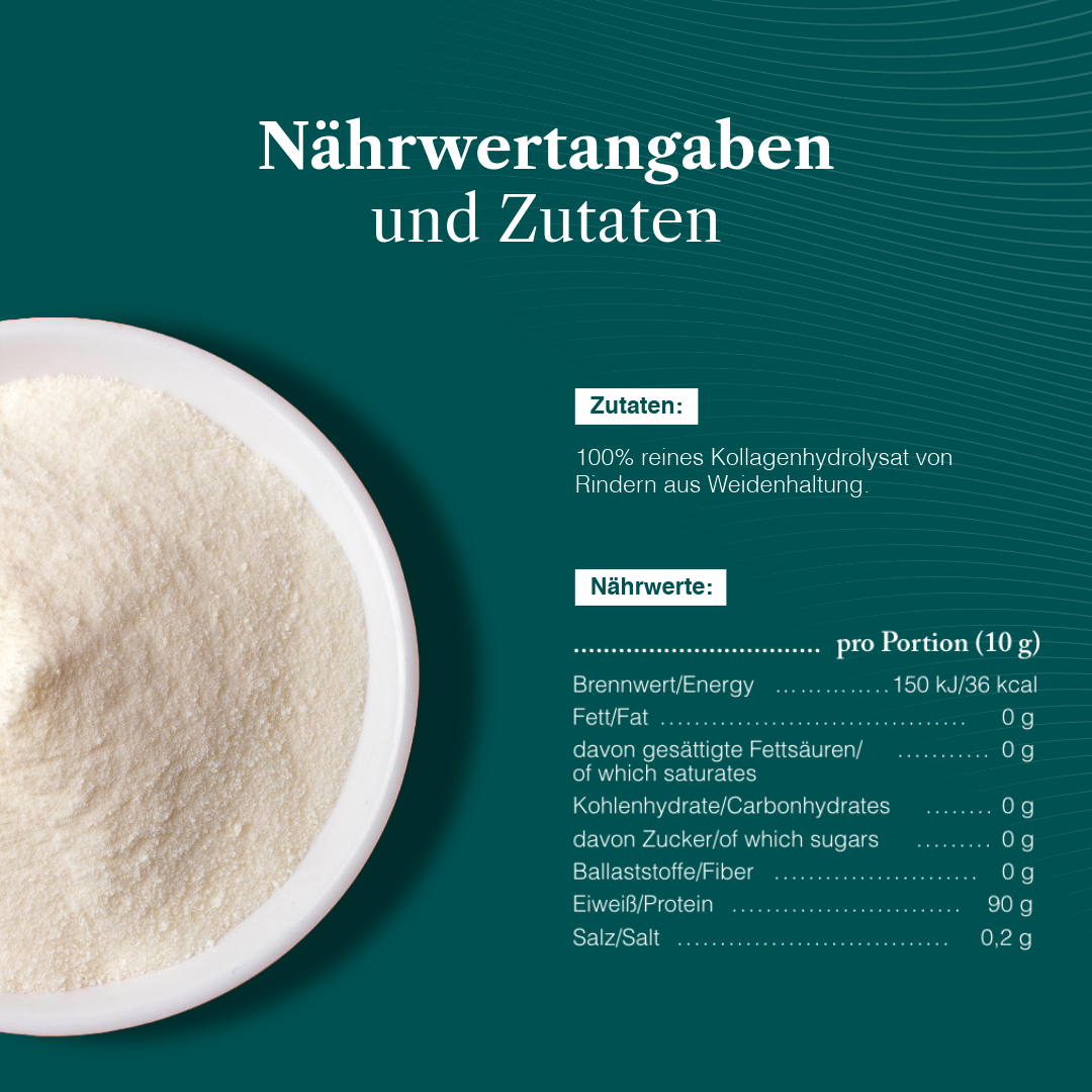 Und ihr Versprechen in eigenen Worten: “Wir glauben an Naturkraft, Wirkung und Nachhaltigkeit. Unsere Kollagenprodukte bestehen zu 100% aus natürlichen Inhalten, ihre Wirkaussagen basieren auf anerkannten Studien. Unsere Rohstoffe stammen von Rindern aus zertifizierter Weidehaltung, die über 300 Tage im Jahr auf grünen Weiden grasen.”