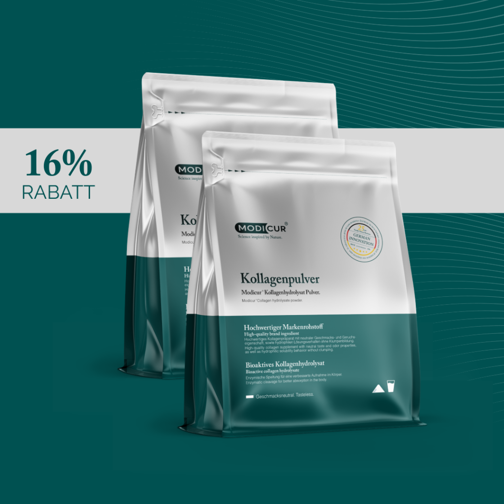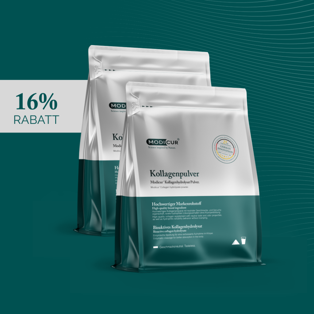 Durch die regelmäßige Einnahme von Modicur Kollagen Pulver berichten viele Anwenderinnen von volleren und glänzenderen Haaren, strafferer und leuchtenderer Haut und stabileren und glatteren Nägel. Außerdem unterstützen die Proteine den Erhalt normaler Knochen und der Muskulatur.